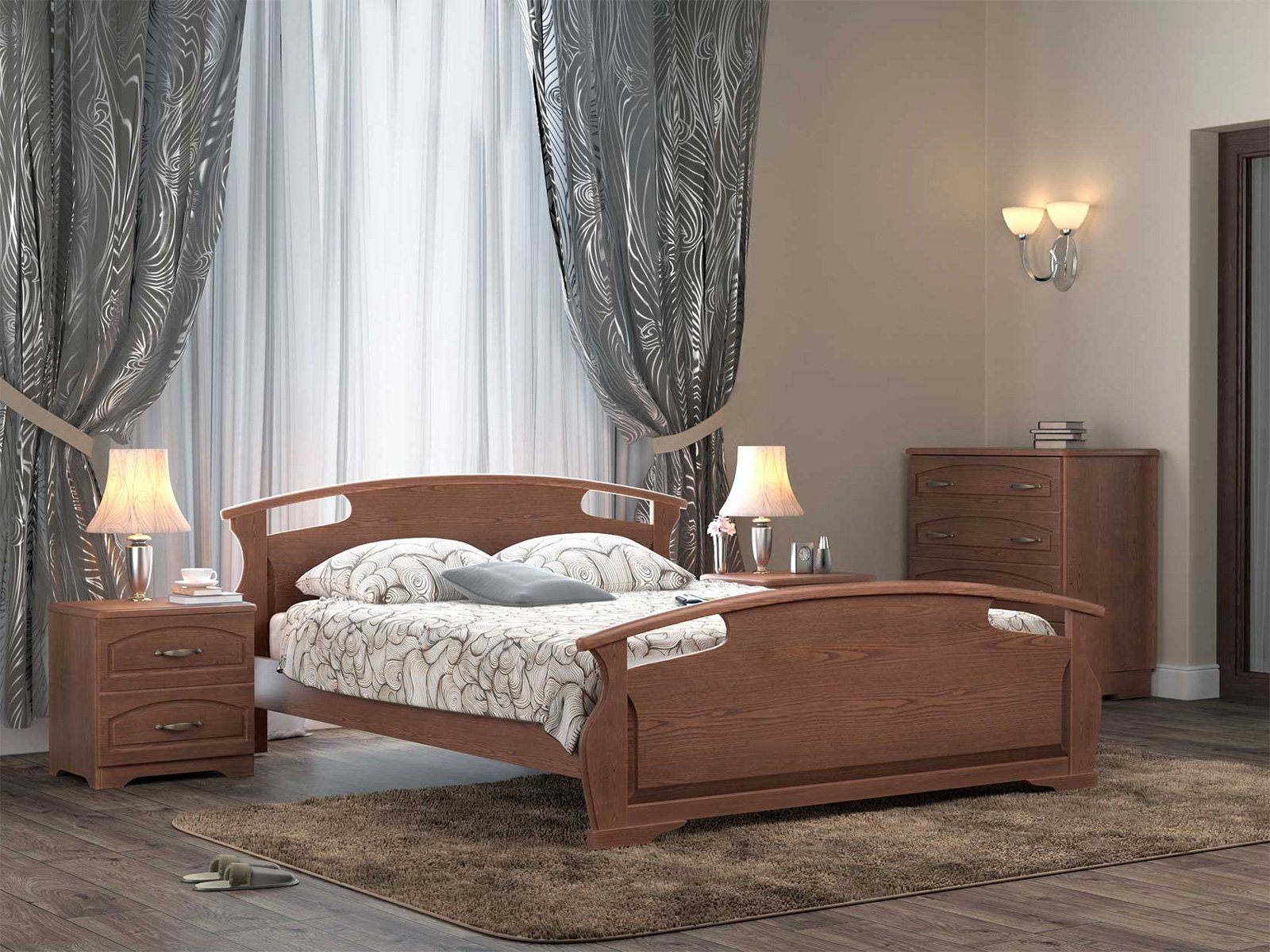 Двуспальная шикарная кровать Афродита из массива ясеня с высоким изножьем - это лучший выбор для Вас и Вашей семьи. Сложные гнуто-клееные элементы декора кровати, превосходно впишутся в любой интерьер. Кровать из массива ценной породы дерева – ясеня - гарантия экологической чистоты в Вашем доме. Такие кровати отличаются долговечностью и надежностью. Вся мебель покрывается высококачественным полиуретановым лаком (Испания), что защищает поверхность от царапин и прочих повреждений.
