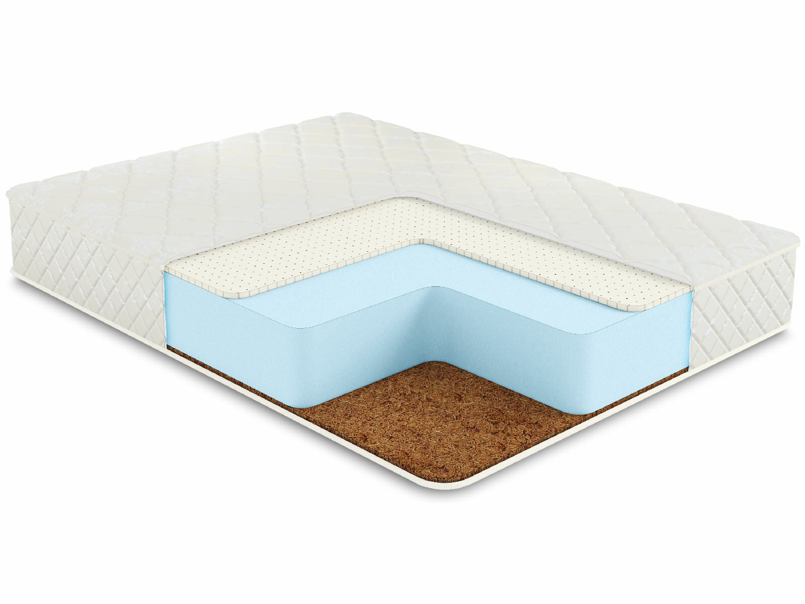 Внутри матраса скрыты три вида наполнителей, которые и обеспечивают вышеописанные качества. У одной стороны проложен натуральный латекс, который даёт более мягкий эффект. У другой стороны установлена кокосовая койра, гарантирующая повышенную жёсткость. А между этими тонкими слоями скрывается прочный искусственный латекс. Он перераспределяет нагрузку, отлично амортизирует и обладает собственным эффектом поддержки.