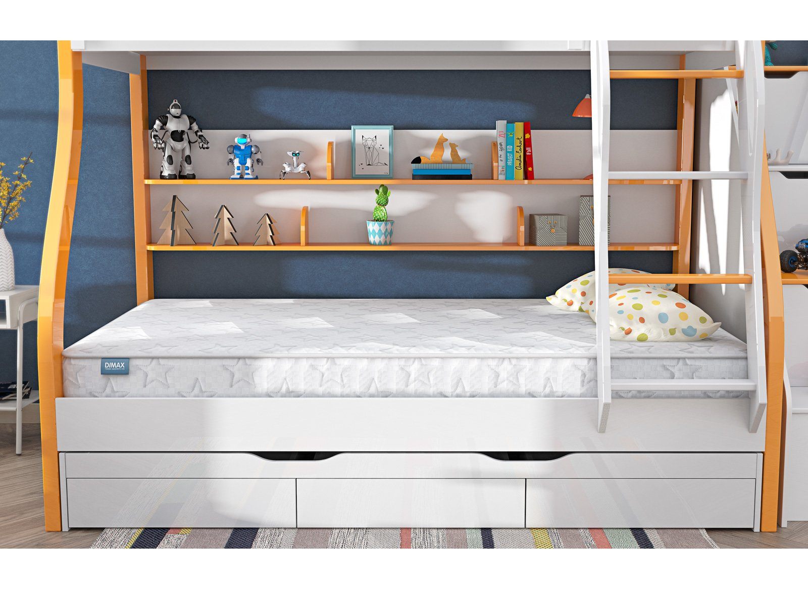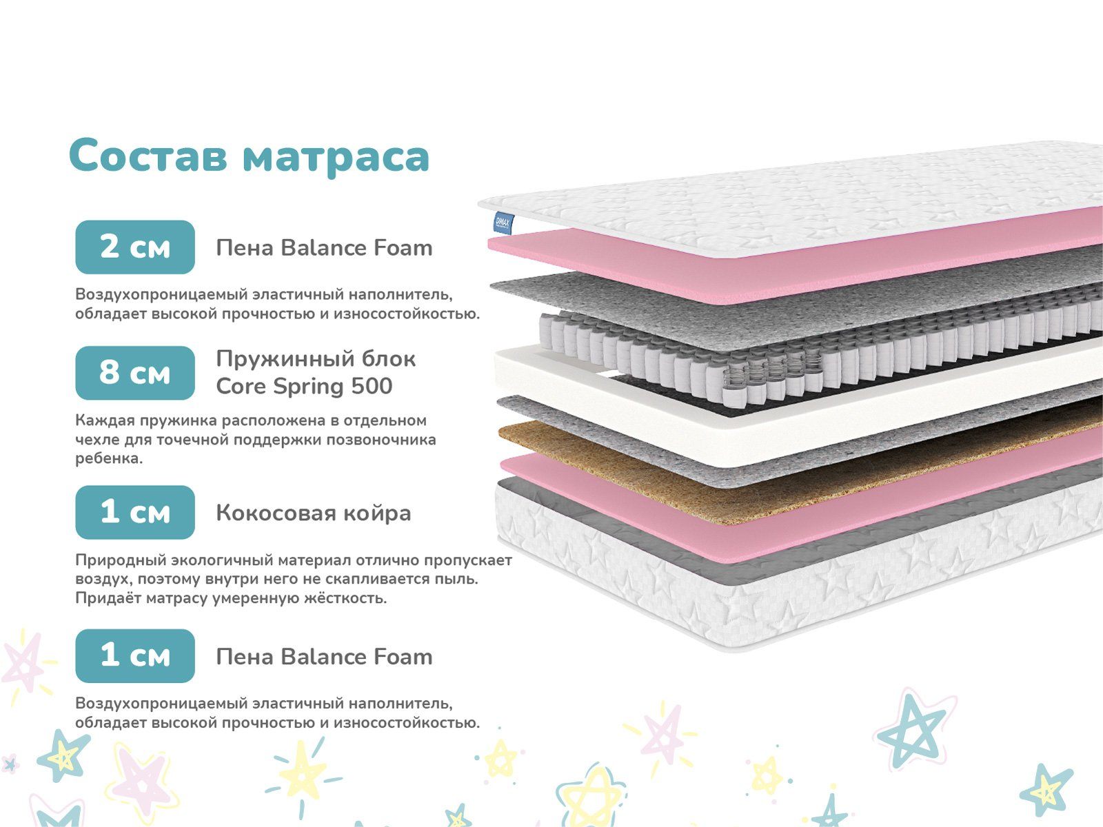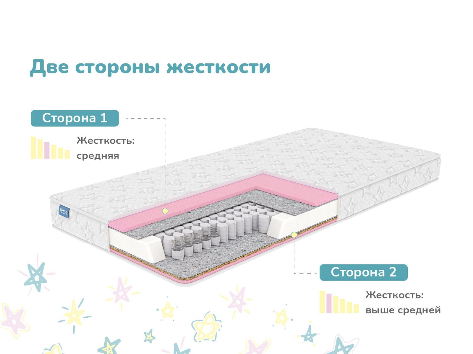 Димакс Галактика – это удобный детский матрас с двухсторонним наполнением, который по мере роста и взросления ребёнка можно переворачивать и менять уровень жёсткости. Одна сторона обладает более высокой жёсткостью, вторая — мягкая и упругая. В основе лежит компактный и прочный независимый блок пружин, отвечающий за правильную поддержку позвоночника.