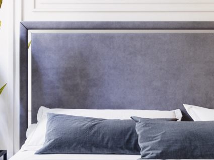 Спейс — кровать в современном стиле. Прямое мягкое изголовье украшено тонкой зеркальной вставкой по периметру.