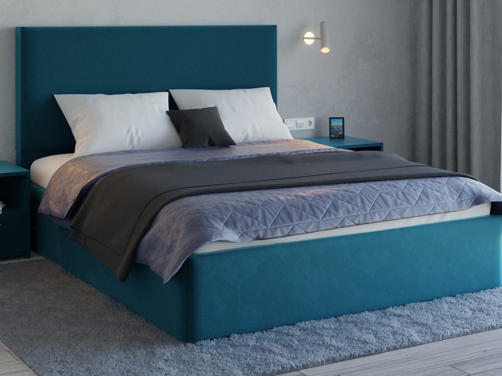 Мягкая кровать с обивкой из велюра.