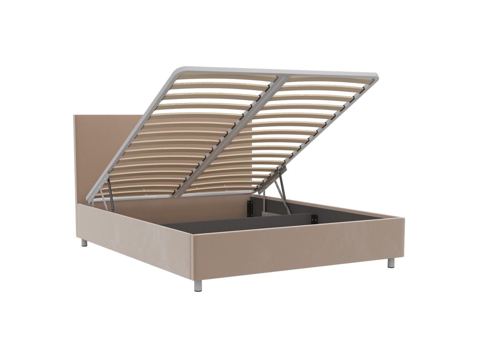 Кровать оснащена подъемным основанием с ламелями, под которым находится вместительный ящик для хранения. Рекомендуемая высота матраса от 13 см, вес матраса до 50 кг.