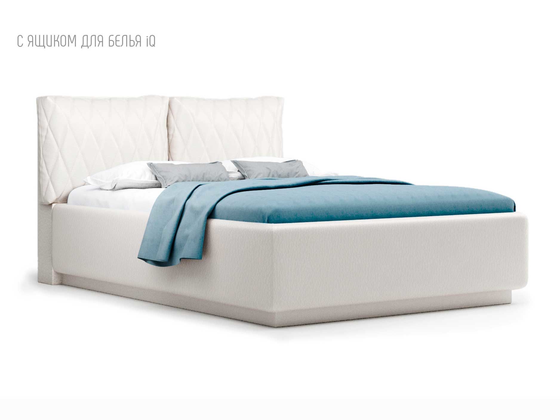 Кровать укомплектована IQ с подъемным механизмом и ящиком для белья без дна (дополнительная платная опция - дно к ящику IQ из HDF (ХДФ). Каркас кровати на цоколе, декоративный чехол на цоколе съёмный. Глубина ящика для белья - 30 см, без ограничения нагрузки на ящик.