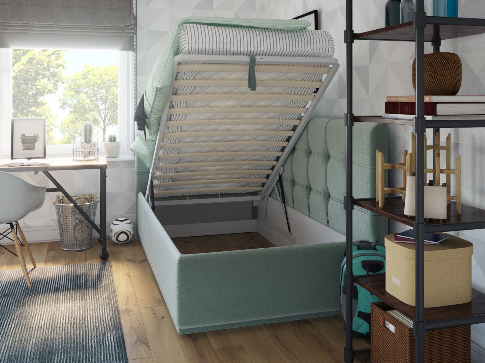 Кровать укомплектована IQ с подъемным механизмом и ящиком для белья без дна (дополнительная платная опция - дно к ящику IQ из HDF (ХДФ). Каркас кровати на цоколе, декоративный чехол на цоколе съёмный. Глубина ящика для белья - 30 см, без ограничения нагрузки на ящик.