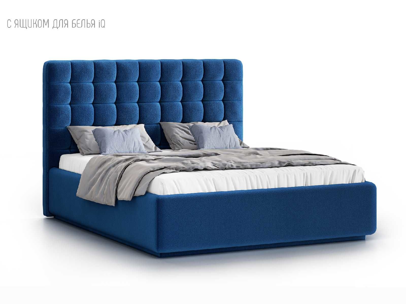 Кровать укомплектована IQ с подъемным механизмом и ящиком для белья без дна (дополнительная платная опция - дно к ящику IQ из HDF (ХДФ). Каркас кровати на цоколе, декоративный чехол на цоколе съёмный. Глубина ящика для белья - 30 см, без ограничения нагрузки на ящик.
