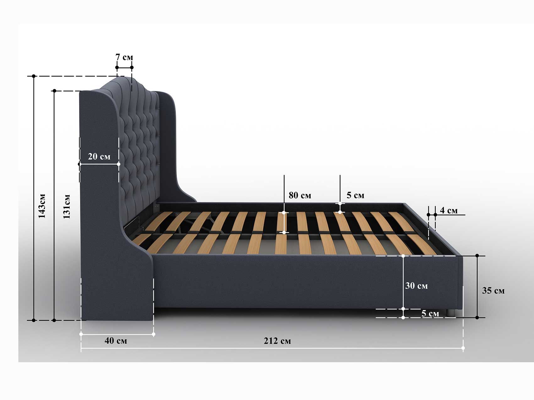 В кровати установлено металлическое основание с деревянными ламелями. Рейки умеют подстраиваться под нагрузку и работу матраса с ортопедическим эффектом. Механизм обеспечивает долгую и надёжную службу спальной принадлежности.