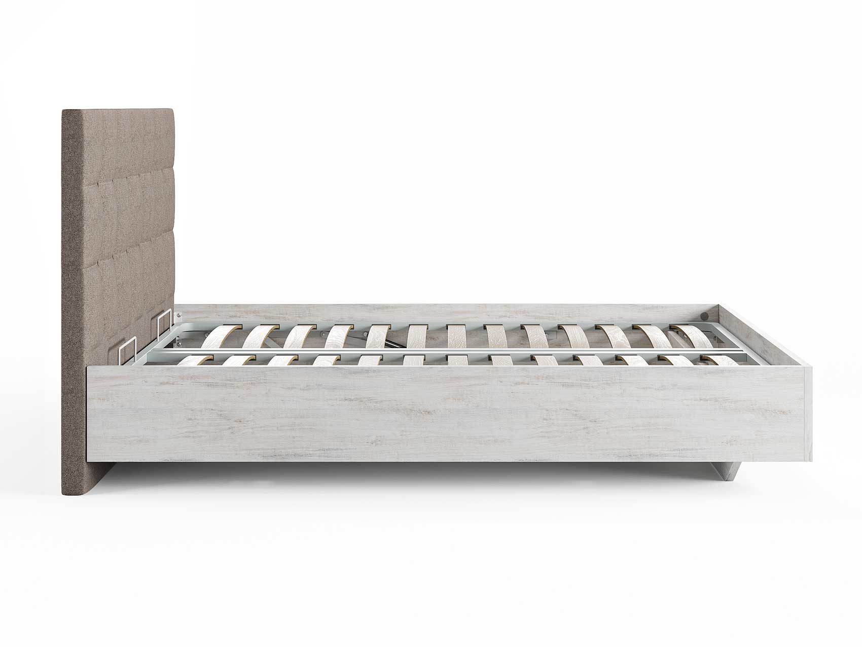 Кровать комплектуется металлическим основанием и подъемным механизмом со вместительным бельевым ящиком. Дно бельевого ящика легко сдвигается для обеспечения уборки под кроватью.