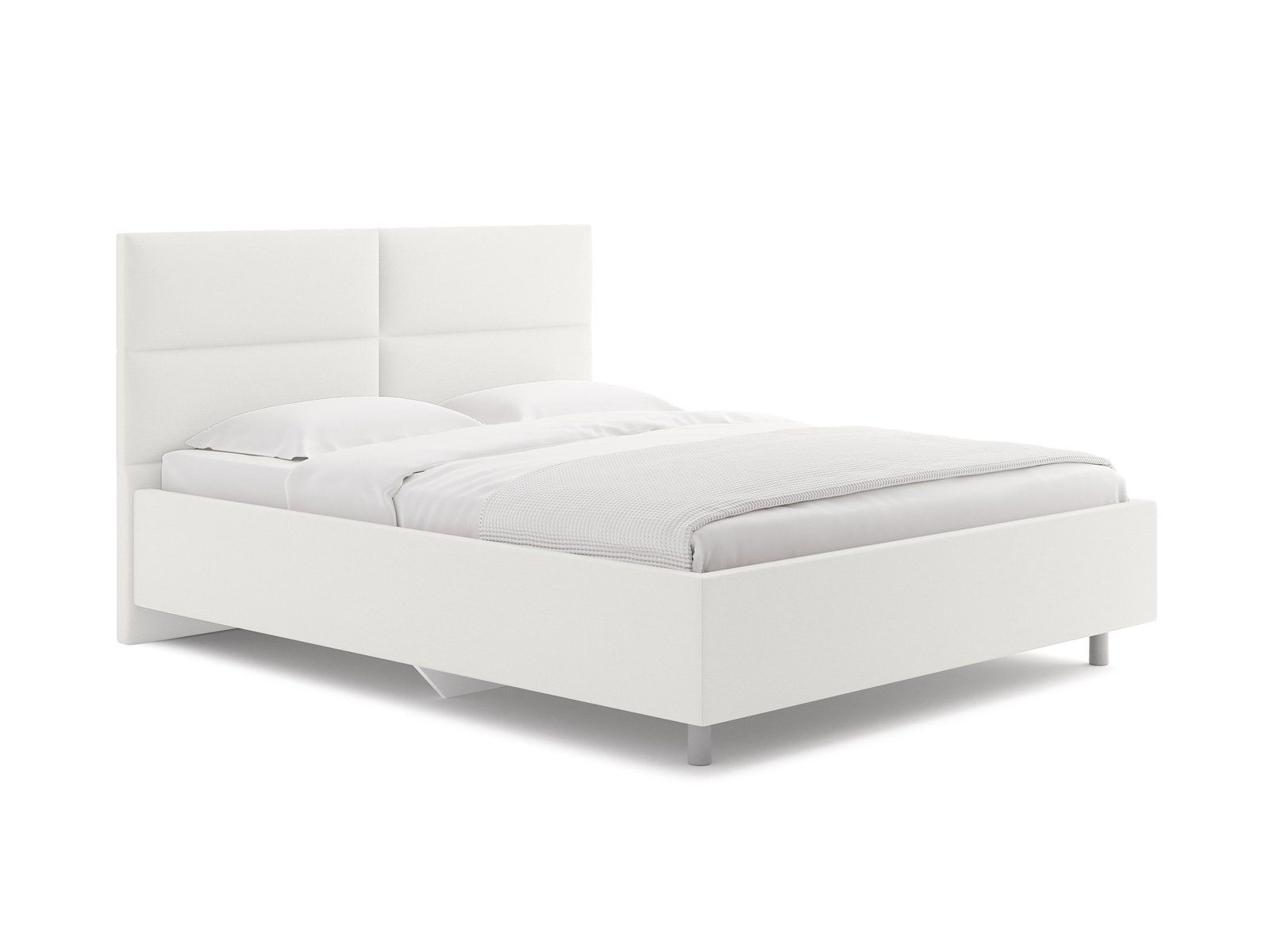 Лаконичная модель с изголовьем из объемных прямоугольников, сшитых между собой. Царги кровати выполняются по технологии съемного чехла. Модель изготовлена из ДСП. Обратная сторона изголовья обита спандбондом, но, при желании, её можно выполнить из основного обивочного материала.