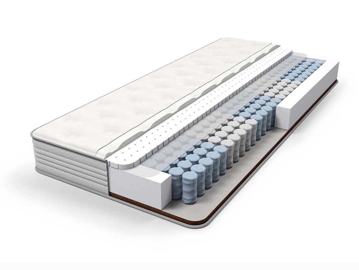Матрас койра латекс имеет в основе блок независимых пружин Pocket Zone, на 5 зон различной степени упругости плотностью 500 пружин на спальное место. Благодаря использованию проволоки различного диаметра каждая из зон получает опору соответствующей для нее жесткости, обеспечивая правильное распределение нагрузки. Матрас с разной жесткостью сторон на основе натуральных наполнителей. С одной стороны натуральный латекс придает матрасу мягкость и комфорт, а кокосовая койра с другой стороны обеспечивает максимальный полезный эффект благодаря повышенной жесткости.