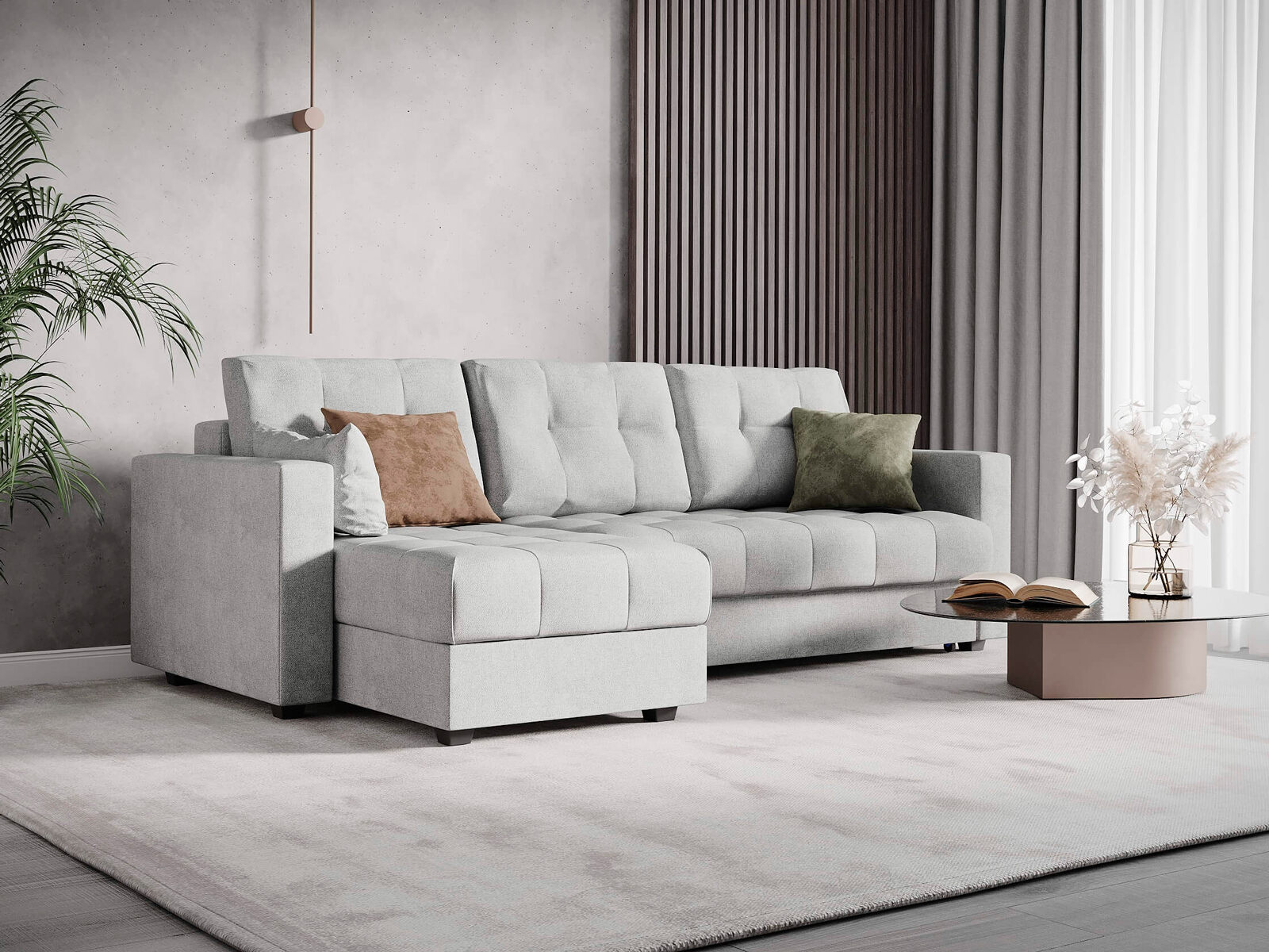 Диван имеет угловую конфигурацию, что позволяет ему идеально вписаться в любой интерьер. Угловая секция, или оттоманка, устанавливается как справа, так и слева, в зависимости от предпочтений и особенностей планировки комнаты, делая диван универсальным решением для любого пространства. Модель оснащена вместительным бельевым коробом, что позволяет эффективно использовать пространство и хранить постельные принадлежности или другие вещи. Матрас средней жесткости обеспечивает оптимальную поддержку и комфорт во время сна, что важно для ежедневного использования.