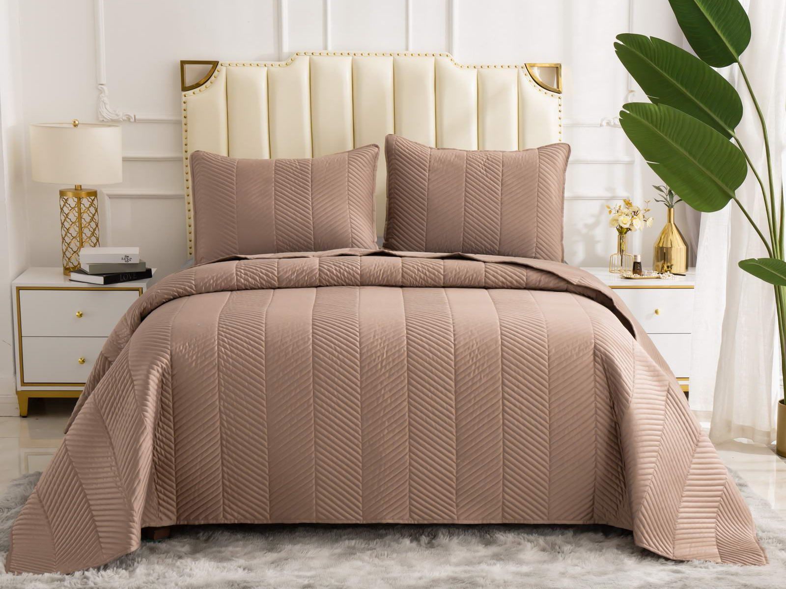 Стёганое дышащее покрывало Адонис на 70% состоит из хлопка и на 30% из вискозы. Ткань изделия гладкая и приятная на ощупь. Декоративный кант и ритмичный «елочный» рисунок, выступающий над поверхностью, придают покрывалу игривый утонченный вид.