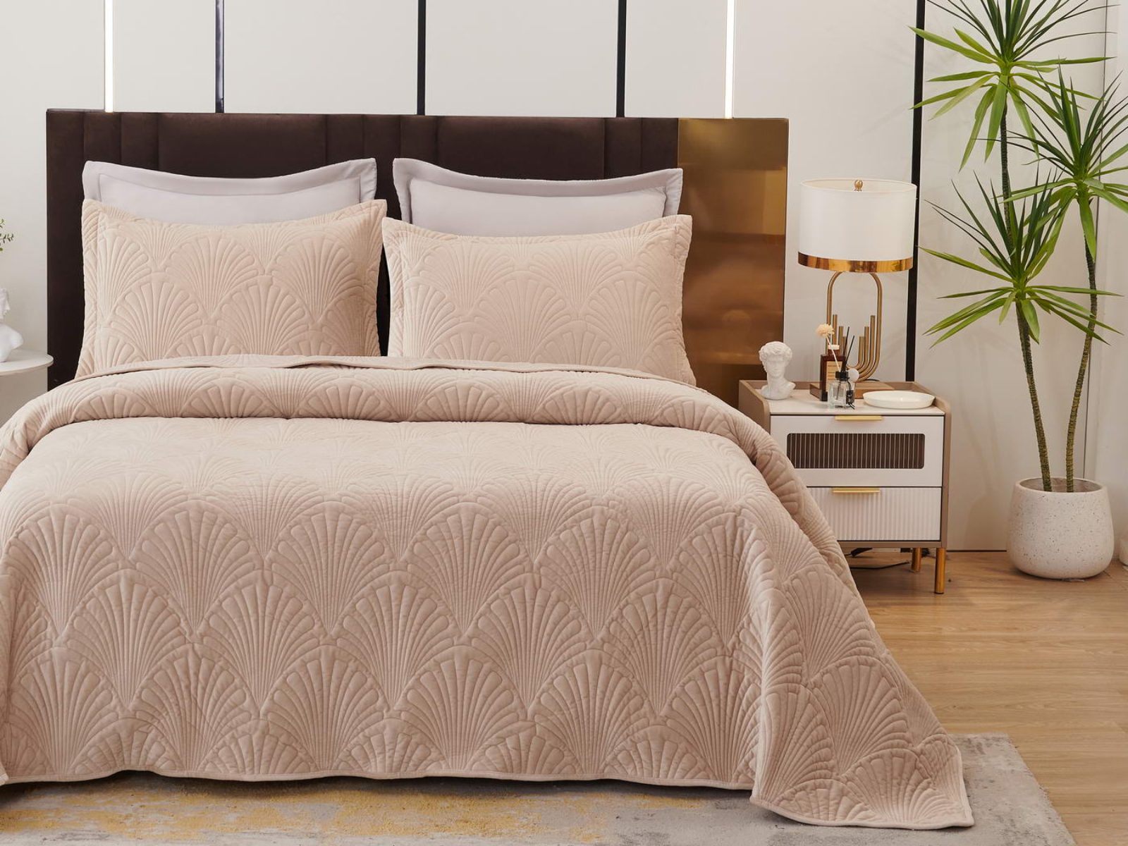 Роскошное велюровое покрывало Ариэль станет изюминкой любого интерьера, ведь оно потрясающе выглядит и приятное на ощупь. Обратите внимание на стежку покрывала – она выполнена в виде ракушек с эффектом 3D. Из-за особого плетения, велюровая ткань покрывала отражает свет и красиво переливается при различном освещении.