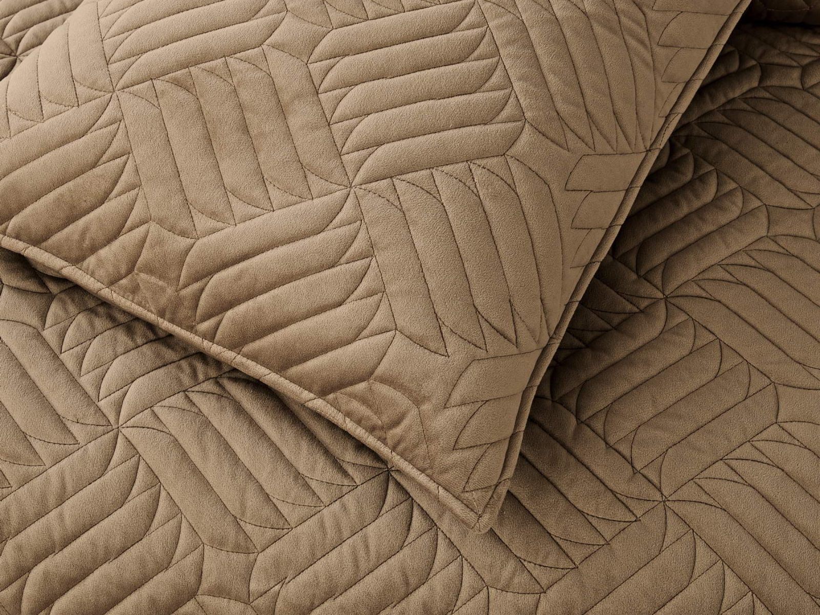 Покрывала выполнены в 10 оттенках: крем, мокко, пепельный, песочный, светло-бежевый, светло-серый, серый, темно-серый, чайная роза и черный. Стежка в виде геометрического орнамента подойдет к любому современному интерьеру. Из-за особого плетения, велюровая ткань покрывала отражает свет и красиво переливается при различном освещении.