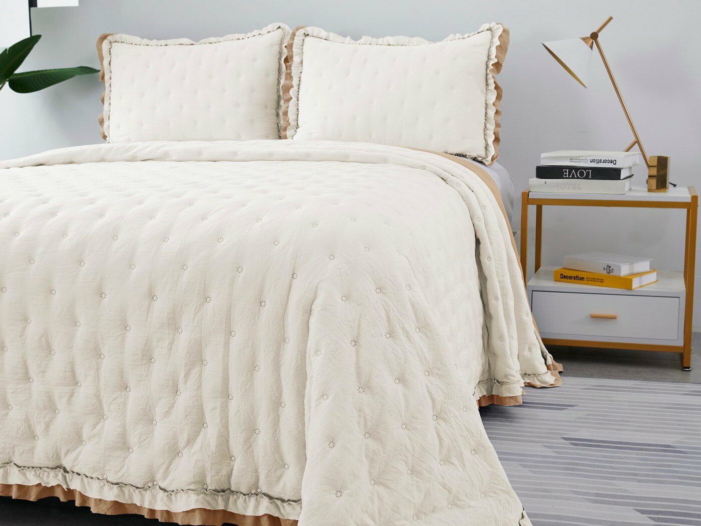Покрывала выполнены в десяти оттенках, они подойдут для различных интерьеров, объединяет коллекцию потрясающее качество и приятный внешний вид. Изделия декорированы рюшами по краю, что подчеркивает из красоту и изысканность.