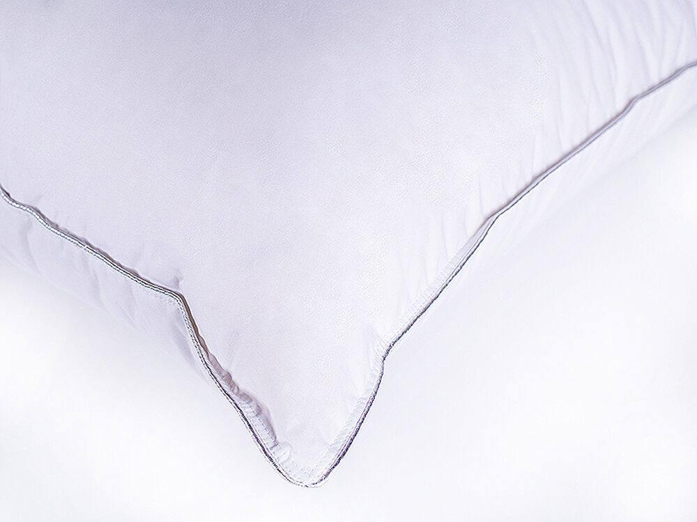 Ткань: 100% хлопок — мерсеризованный тик полотняного переплетения из длинноволокнистого хлопка, обеспечивающего отсутствие ворсистости и однородность ткани. Высокая плотность: 206/155 нитей на 10 см²,135 г/м². Цвет белый, кант серебряного цвета. Двойная отделочная строчка по периметру исключает миграцию наполнителя через швы.